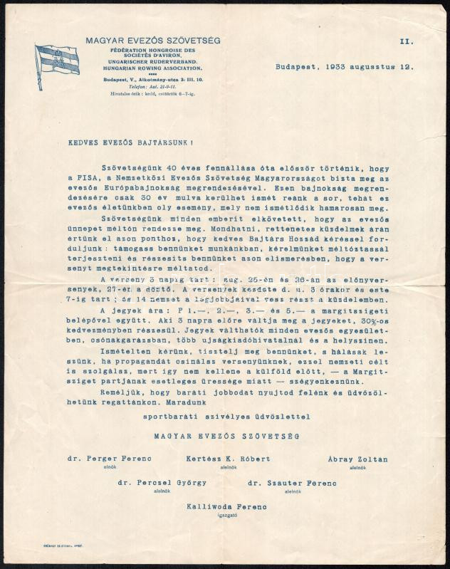 1933 Bp., Magyar Evezős Szövetség felhívása az Európa-bajnokság támoga... https://www.darabanth.com/de/434-Fernauktion/434.0/Kunst-Dokumente-andere-Sammelgebiete/Drucksachen~1000002/1933-Bp-Magyar-Evezos-Szovetseg-felhivasa-az-Europa-bajnoksag-tamogatasara~II2807922