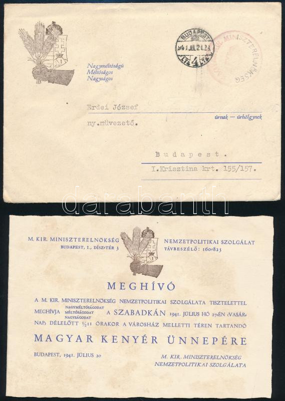 Beschreibung: 1941 Szabadka Magyar Kenyér Ünnepére szóló meghívó a Miniszterelnökség Nemzetpolitikai Szolgálatától. Borítékkal.