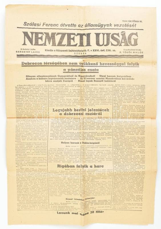 1944 A Nemzeti Újság október 18-i száma, benne Szálasi hatalomátvételé... https://www.darabanth.com/de/434-Fernauktion/434.0/Kunst-Dokumente-andere-Sammelgebiete/Drucksachen~1000002/1944-A-Nemzeti-Ujsag-oktober-18-i-szama-benne-Szalasi-hatalomatvetelevel-uj-kormanyzatta~II2806609