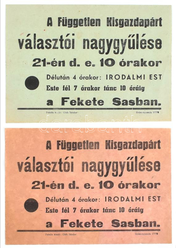 A Független Kisgazdapárt választói nagygyűlése, 2 db röplap https://www.darabanth.com/de/434-Fernauktion/434.0/Kunst-Dokumente-andere-Sammelgebiete/Drucksachen~1000002/A-Fuggetlen-Kisgazdapart-valasztoi-nagygyulese-2-db-roplap~II2810446
