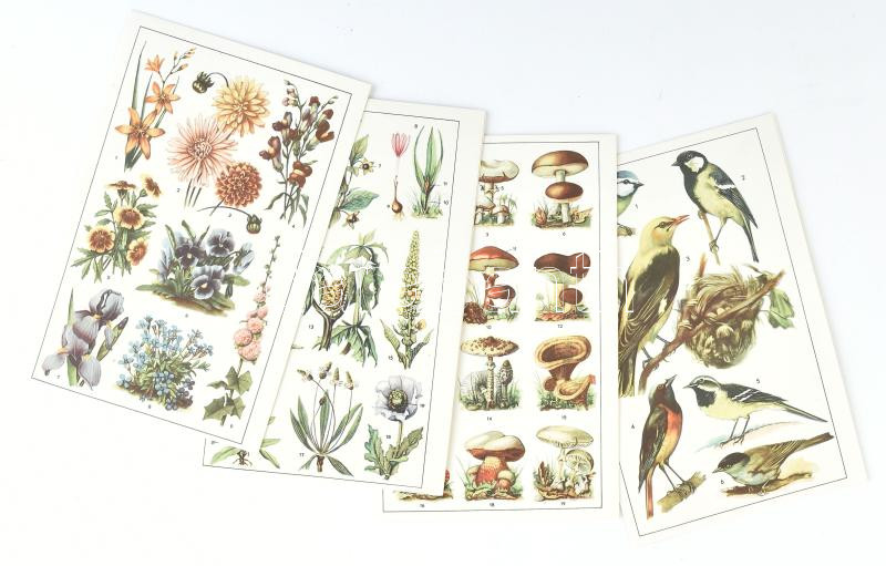 Beschreibung: Ismeretterjesztő kártyák (növények, gombák, madarak, népviseletek), 9 db kétoldalas, színes nyomat, 15,5x10 cm