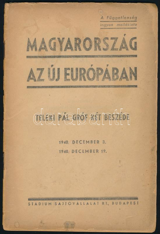 Magyarország az új Európában. Teleki Pál gróf két beszéde. 1940. decem... https://www.darabanth.com/de/434-Fernauktion/434.0/Kunst-Dokumente-andere-Sammelgebiete/Drucksachen~1000002/Magyarorszag-az-uj-Europaban-Teleki-Pal-grof-ket-beszede-1940-december-3-1940-decembe~II2810561