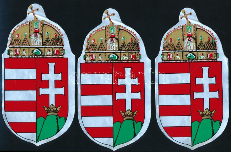 Beschreibung: cca 1990-2020 3 db öntapadós magyar címer, tetején hajtásnyommal, 17,5x8 cm