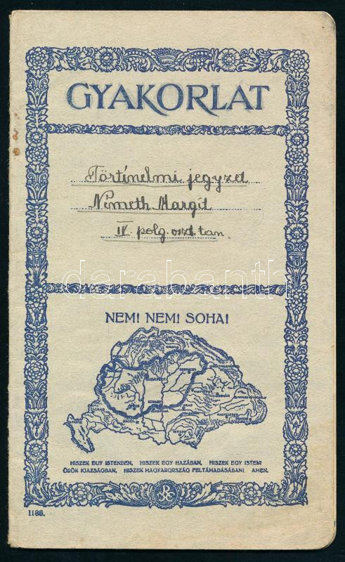 cca 1930-1940 "Nem! Nem! Soha!" irredenta borítójú iskolai füzet, benn... https://www.darabanth.com/de/434-Fernauktion/434.0/Kunst-Dokumente-andere-Sammelgebiete/Historische-Dokumenten-Handschriften~500021/cca-1930-1940-Nem-Nem-Soha-irredenta-boritoju-iskolai-fuzet-benne-tortenelmi-jegyzetekke~II2801986