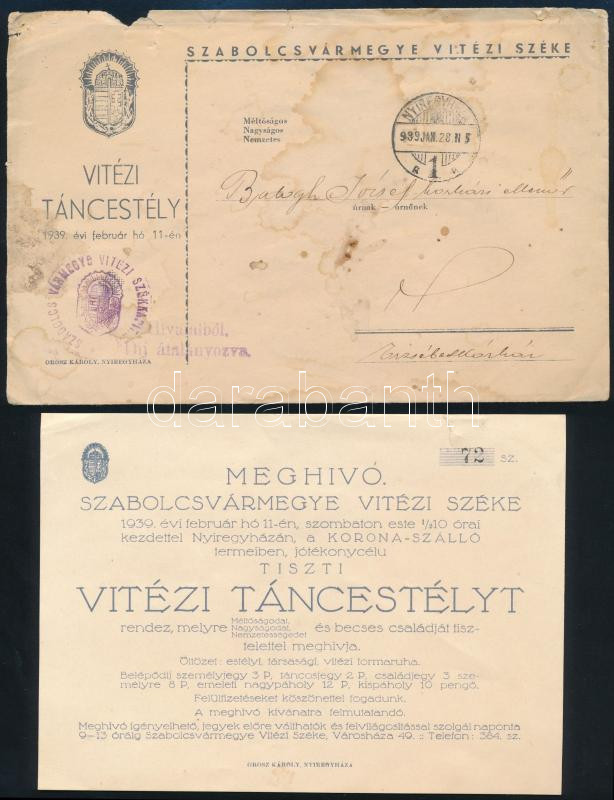 1939 Nyíregyháza, Szabolcsvármegye Vitézi Széke meghívója a Korona szállóban rendezett tiszti vitézi táncestélyre; sorszámozott, kis lapszéli szakadással, eredeti, viseltes borítékban