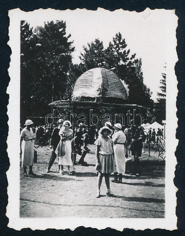 Beschreibung: 1933 balatonfüredi cserkészek és látogatók a Gödöllői Világjamboreen, hátoldalon feliratozott fotó, 4×3 cm