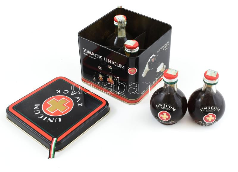 Zwack Unicum, 4×50 ml üveg, fém díszdobozban https://www.darabanth.com/de/434-Fernauktion/434.0/Kunst-Dokumente-andere-Sammelgebiete/Vintage-Weine-Getranke~500017/Zwack-Unicum-4C39750-ml-uveg-fem-diszdobozban~II2809684
