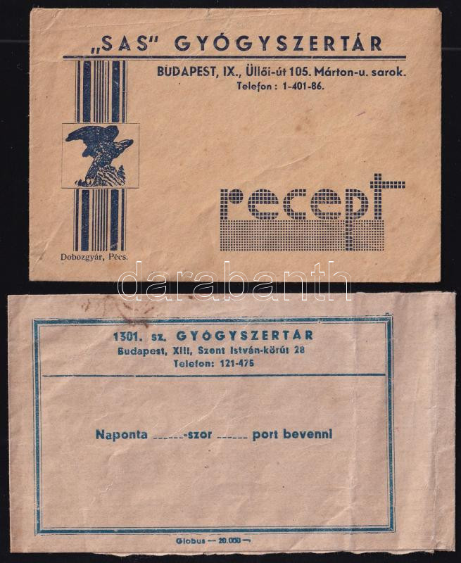 2 db receptboríték az 1940-es évekből: Sas gyógyszertár, 1301sz. gyógy... https://www.darabanth.com/de/434-Fernauktion/434.0/Kunst-Dokumente-andere-Sammelgebiete/Werbungen~500024/2-db-receptboritek-az-1940-es-evekbol-Sas-gyogyszertar-1301sz-gyogyszertar~II2809773