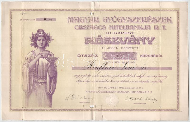 Budapest 1912. "Magyar Gyógyszerészek Országos Hitelbankja R.T." névre... https://www.darabanth.com/de/434-Fernauktion/434.0/Numismatik/Aktien-und-Tickets~1500005/Budapest-1912-Magyar-Gyogyszereszek-Orszagos-Hitelbankja-RT-nevre-szolo-reszvenye-500K-~II2809027