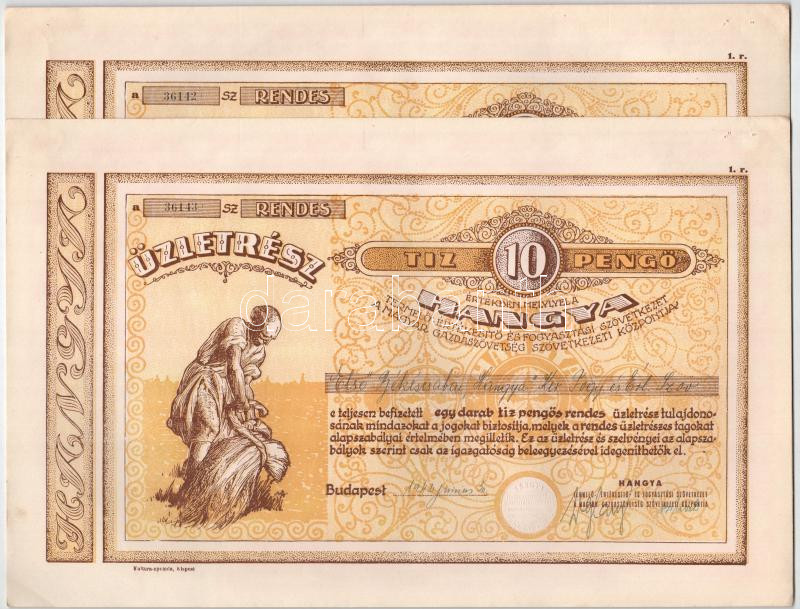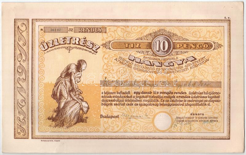Budapest 1940. "Hangya Termelő-Értékesítő és Fogyasztási Szövetkezet" ... https://www.darabanth.com/de/434-Fernauktion/434.0/Numismatik/Aktien-und-Tickets~1500005/Budapest-1940-Hangya-Termelo-Ertekesito-es-Fogyasztasi-Szovetkezet-uzletresze-10P-rol-~II2803792
