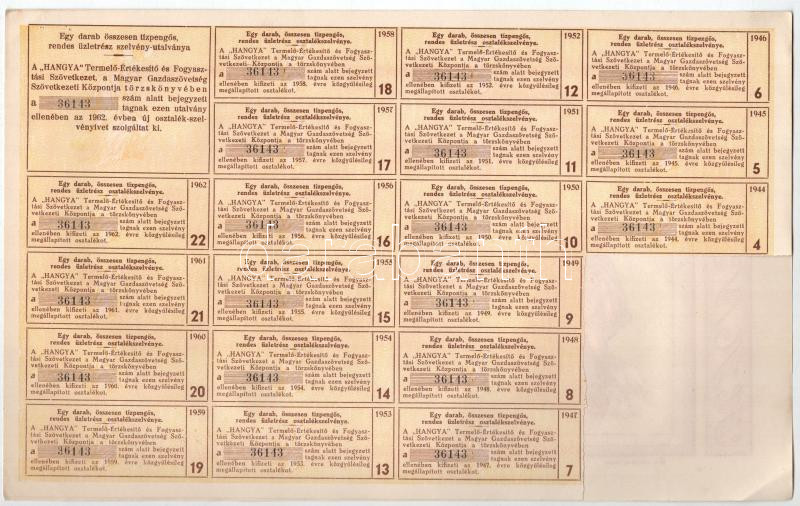 Beschreibung: Budapest 1940. "Hangya Termelő-Értékesítő és Fogyasztási Szövetkezet" üzletrésze 10P-ről (2x) szelvényekkel, szárazpecséttel, sorszámkövetők T:I-
