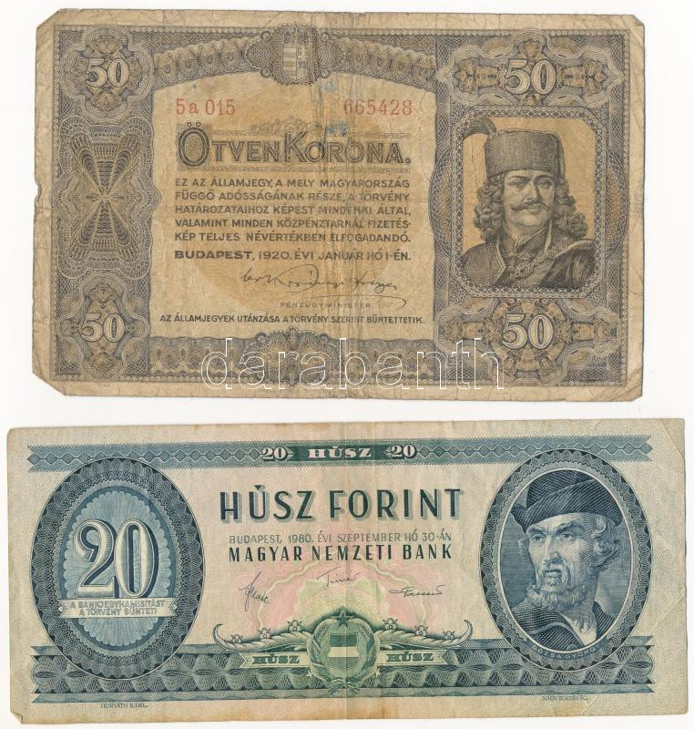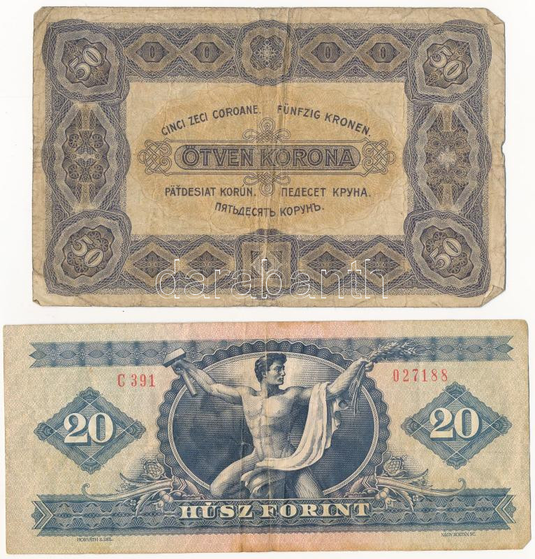 1920. 50K "Orell Füssli Zürich" + 1980. 20Ft T:III saroktörés https://www.darabanth.com/de/434-Fernauktion/434.0/Numismatik/Ungarische-Banknoten~1500007/1920-50K-Orell-Fussli-Zurich-plus-1980-20Ft-TIII-saroktores~II2810318