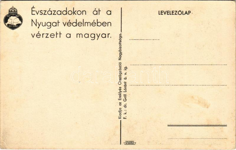 Évszázadokon át a Nyugat védelmében vérzett a magyar. Kiadja az Ereklyés Országzászló Nagybizottsága / Hungarian irredenta propaganda, Treaty of Trianon s: Lamoss (EK)