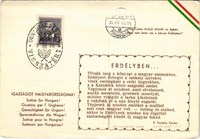 Igazságot Magyarországnak! Míg Csaba királyfi őrködik az égben, népe nem lehet rab a bérces Erdélyben! / Justice for Hungary! Hungarian irredenta propaganda with Hungarian flag decoration + "1938 Dunaszerdahely visszatért" So. Stpl. (EK)