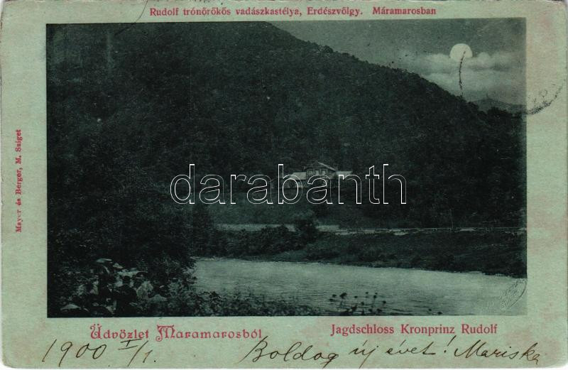 1900 Erdészvölgy, Kuzij (Lonka, Luh; Tisza-völgy, Máramaros); Rudolf trónörökös vadászkastélya a Tisza folyammal este. Mayer és Berger kiadása / royal hunting castle in the valley, hunting lodge, Tisza river at night (Rb)