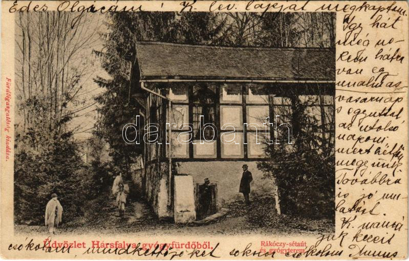 Beschreibung: 1907 Hársfalva-gyógyfürdő (Szolyva), Nelipino, Nelipyno; Rákóczy sétaút és gyógyterem. Fürdőigazgatóság kiadása / promenade and spa