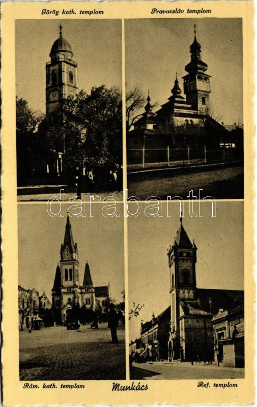 Munkács, Mukacheve, Mukacevo; Görögkatolikus templom, Pravoszláv templom, Római katolikus templom, Református templom / Greek Catholic church, Orthodox church, Catholic church, Calvinist church