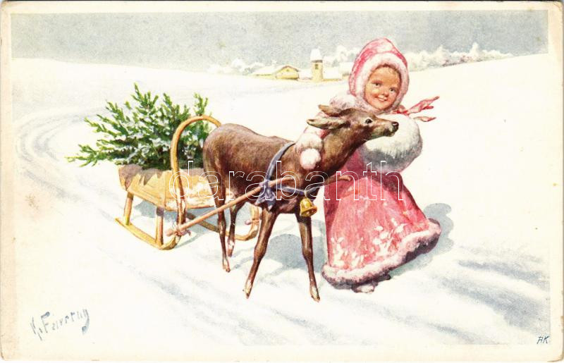 Beschreibung: Kislány karácsonyi őzikével / Girl with Christmas deer. B.K.W.I. 2933-5. s: K. Feiertag