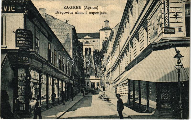 1915 Zagreb, Zágráb, Agram; Bregovita ulica i uspenjaca, Underwood, Dr. V. Jelovsek, I. Bozicevic / utca és sikló, üzletek / street, funicular, shops (EK)