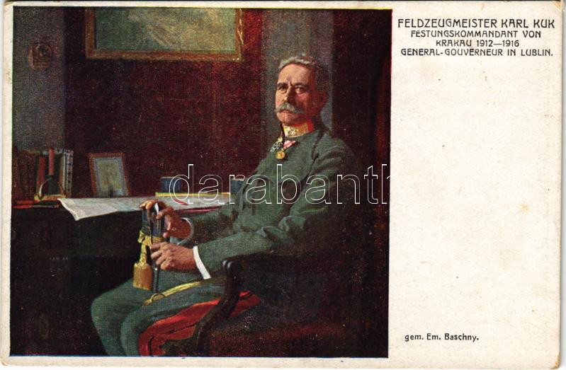 Feldzeugmeister Karl Kuk. Festungskommandant von Krakau 1912-1916. General-Gouverner in Lublin. Offizielle Karte für Rotes Kreuz, Kriegsfürsorgeamt, Kriegshilfsbüro Nr. 609. K.F.A. Heerführer-Serie / WWI Austro-Hungarian K.u.K. military art postcard s: Em. Baschny (EK)