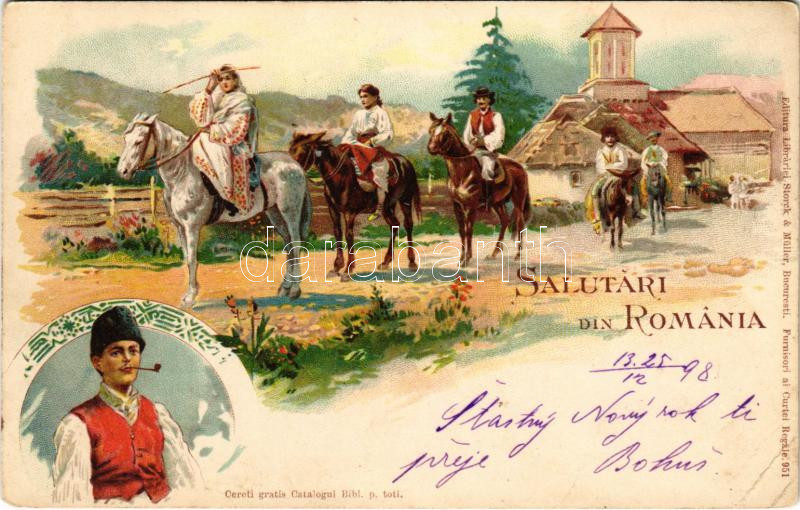 1898 (Vorläufer) Salutari din Romania. Folklore, Art Nouveau, floral, ... https://www.darabanth.com/de/435-Fernauktion/435.0/Ansichtskarten/Rumanien~2500063/1898-Vorlaufer-Salutari-din-Romania-Folklore-Art-Nouveau-floral-litho-EK~II2818066