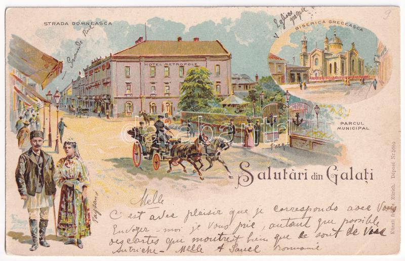 1901 Galati, Galatz; Strada Domneasca, Biserica Greceasca, Parcul Municipal, Hotel Metropole / street view, church, park, hotel. Künzli Art Nouveau, floral, litho (EK)
