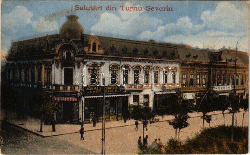 1924 Turnu Severin, Szörényvár; street view, shop of Josef Frisch (fl) https://www.darabanth.com/de/435-Fernauktion/435.0/Ansichtskarten/Rumanien~2500063/1924-Turnu-Severin-Szorenyvar-street-view-shop-of-Josef-Frisch-fl~II2818371