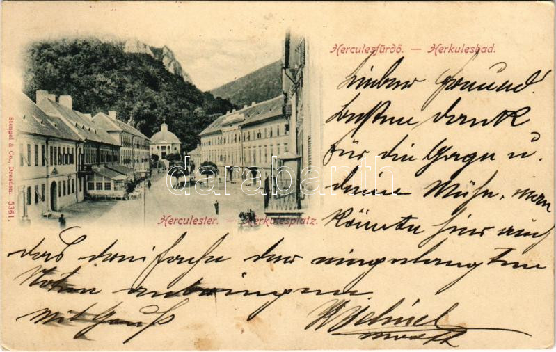 1897 (Vorläufer) Herkulesfürdő, Baile Herculane; Hercules tér / square https://www.darabanth.com/de/435-Fernauktion/435.0/Ansichtskarten/Siebenburgen~2500008/1897-Vorlaufer-Herkulesfurdo-Baile-Herculane-Hercules-ter-square~II2822972