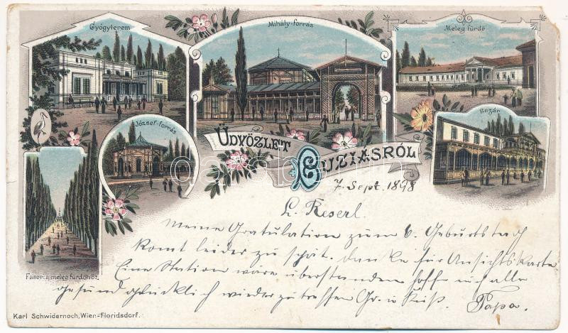 1898 (Vorläufer) Buziás, Buziásfürdő, Baile Buzias; Gyógyterem, Mihály-forrás, Meleg fürdő, Fasor a meleg fürdőhöz, József-forrás, Bazár / spa, bath, spring source, promenade, bazaar. Karl Schwidernoch Art Nouveau, floral, litho (EM)