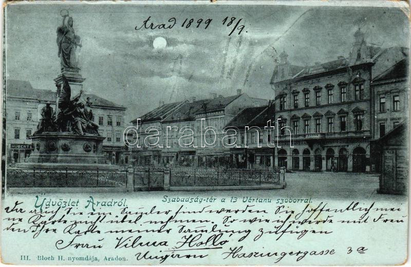 1899 (Vorläufer) Arad, Szabadság tér, 13 vértanu szobor, este, Fiume kávéház, Derestye Gyula, Farber Lajos, Hubert és Rosenberg üzlete. Boch H. nyomda kiadása / martyrs' statue, square, night, shops, cafe (EK)