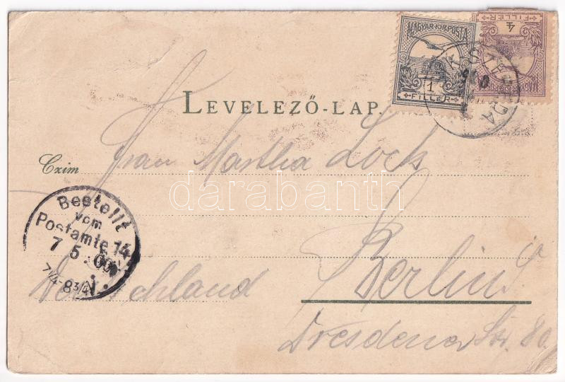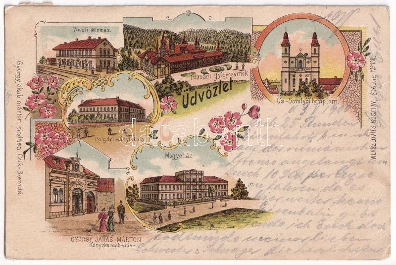 1900 Csíkszereda, Miercurea Ciuc; Vasútállomás, Tusnádi gyógycsarnok, Csíksomlyói templom, Polgári leányiskola, Megyeháza, György Jakab Márton üzlete és saját kiadása. Wlaszlovits Gusztáv No. 130. / railway station, spa, church, girls school, county hall, publisher's shop. Art Nouveau, floral, litho (EB)