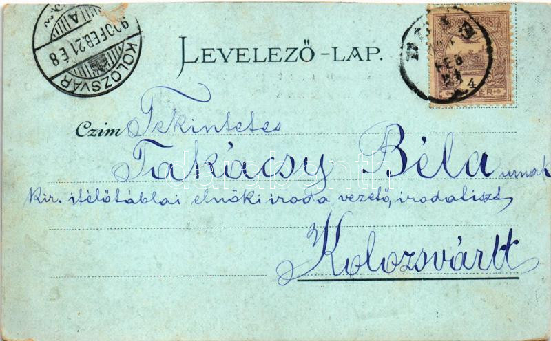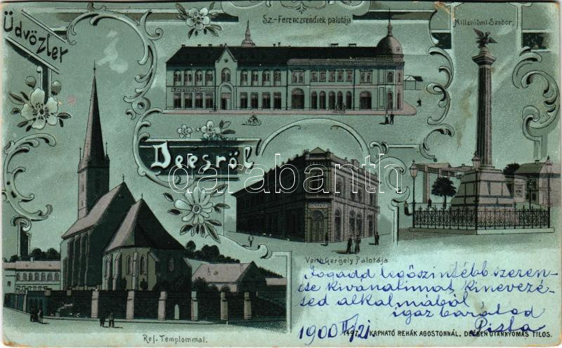 1900 Dés, Dej; Szt. Ferenc rendiek palotája, református templom, Milleniumi szobor (1919-ben ledöntötték), Voith Gergely palotája. Kapható Rehák Ágostonnál / church, palace, monument (demolished in 1919). Art Nouveau, floral, litho (vágott / cut)