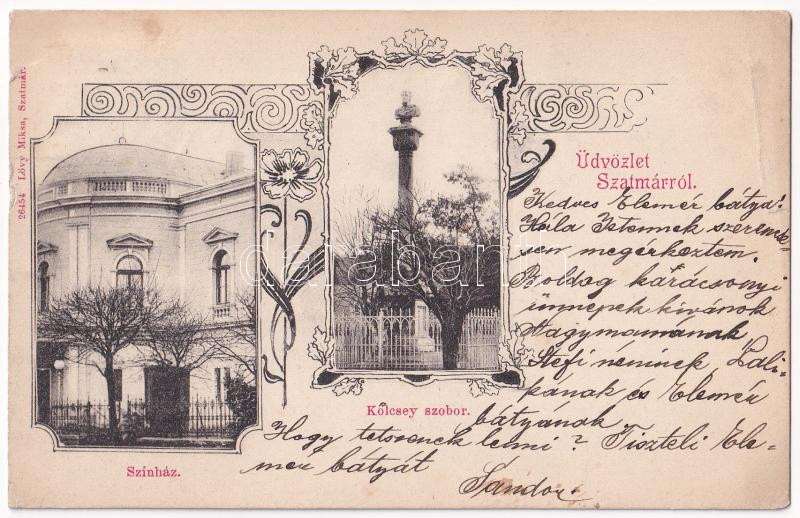 Beschreibung: 1901 Szatmárnémeti, Szatmár, Satu Mare; Színház, Kölcsey szobor. Lövy Miksa kiadása / theatre, statue, monument. Art Nouveau, floral (EB)