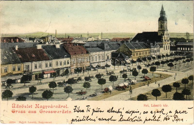 1902 Nagyvárad, Oradea; Szent László tér, piac, Huzella M. és Auslände... https://www.darabanth.com/de/435-Fernauktion/435.0/Ansichtskarten/Siebenburgen~2500008/1902-Nagyvarad-Oradea-Szent-Laszlo-ter-piac-Huzella-M-es-Auslander-uzlete-square-mark~II2817714