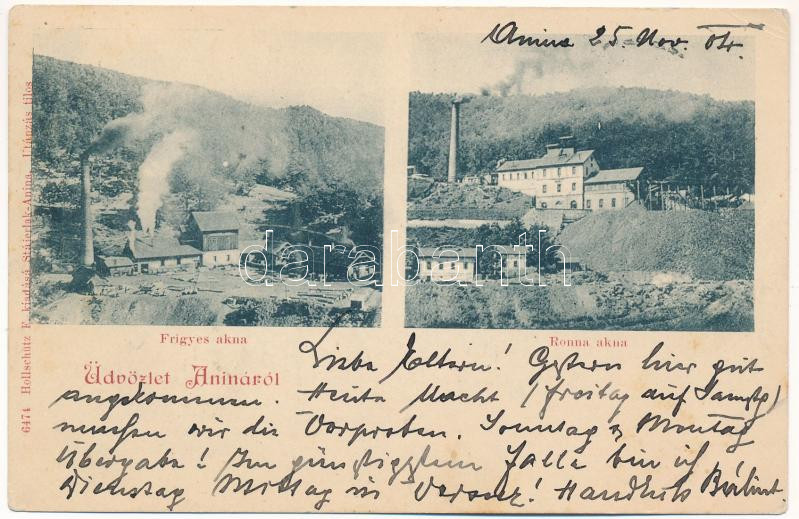 1904 Anina, Stájerlakanina, Steierdorf; Frigyes és Ronna akna, bánya. ... https://www.darabanth.com/de/435-Fernauktion/435.0/Ansichtskarten/Siebenburgen~2500008/1904-Anina-Stajerlakanina-Steierdorf-Frigyes-es-Ronna-akna-banya-Hollschutz-F-kiadasa-m~II2816592