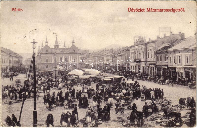 1906 Máramarossziget, Sighet, Sighetu Marmatiei; Fő tér és piac, árusok, Angol bolt, üzletek. Wizner és Dávid kiadása / main square, market, shops (EK)