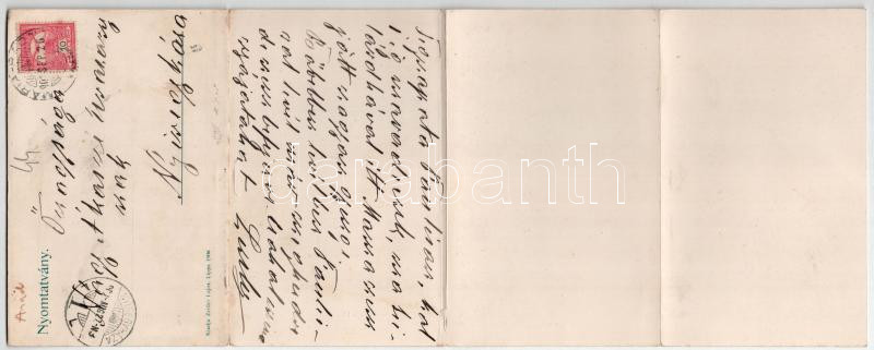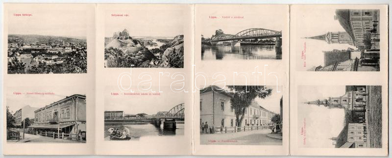 1908 Lippa, Lipova; József főherceg szálloda, Solymosi vár, Kereskedelmi iskola, vashíd, zárda, főerdőhivatal, görögkeleti és római katolikus templom. Zeitler Lajos kiadása, 4-részes kinyitható képeslap / hotel, castle, shool, bridge, Orthodox and Catholic churches, nunnery, forestry office - 4 -tiled folding postcard (hajtásnál szakadt / bent til broken)