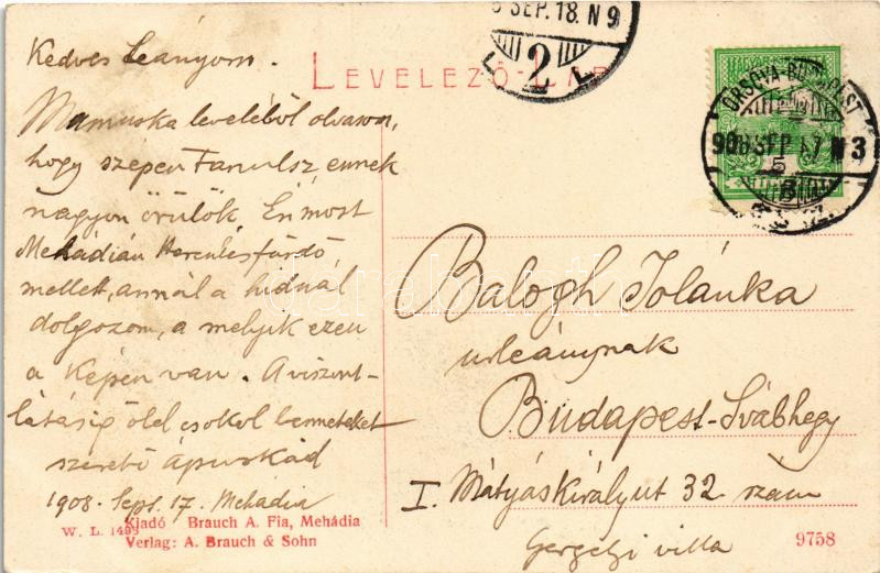 1908 Mehádia, Mehadia; vasúti híd. W.L. 1496. Brauch A. Fia kiadása / ... https://www.darabanth.com/de/435-Fernauktion/435.0/Ansichtskarten/Siebenburgen~2500008/1908-Mehadia-Mehadia-vasuti-hid-WL-1496-Brauch-A-Fia-kiadasa-general-view-railway-brid~II2820698