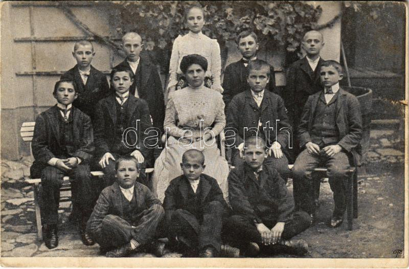 Beschreibung: 1911 Boksánbánya, Németbogsán, Deutsch-Bogsan, Bocsa Montana; Privrednik kadétok Melania Panayot biztosasszonnyal (tanárnővel) / Privrednik's apprentices with the trustee (szakadás / tear)