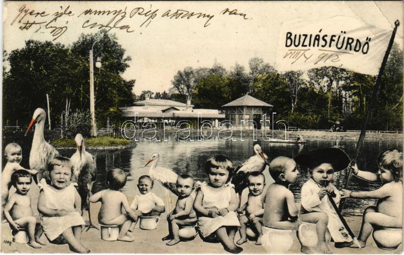 Beschreibung: 1912 Buziás, Buziásfürdő, Baile Buzias; Fürdő. Francz József kiadása. Montázs gólyákkal és gyerekkel / spa park. Montage with storks and children (EK)