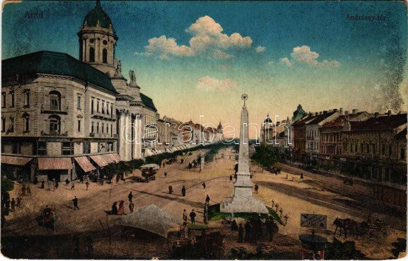 1913 Arad, Andrássy tér, műemlék, piac, Központi divatáruház üzlete, a... https://www.darabanth.com/de/435-Fernauktion/435.0/Ansichtskarten/Siebenburgen~2500008/1913-Arad-Andrassy-ter-muemlek-piac-Kozponti-divataruhaz-uzlete-autobusz-square-mar~II2719475