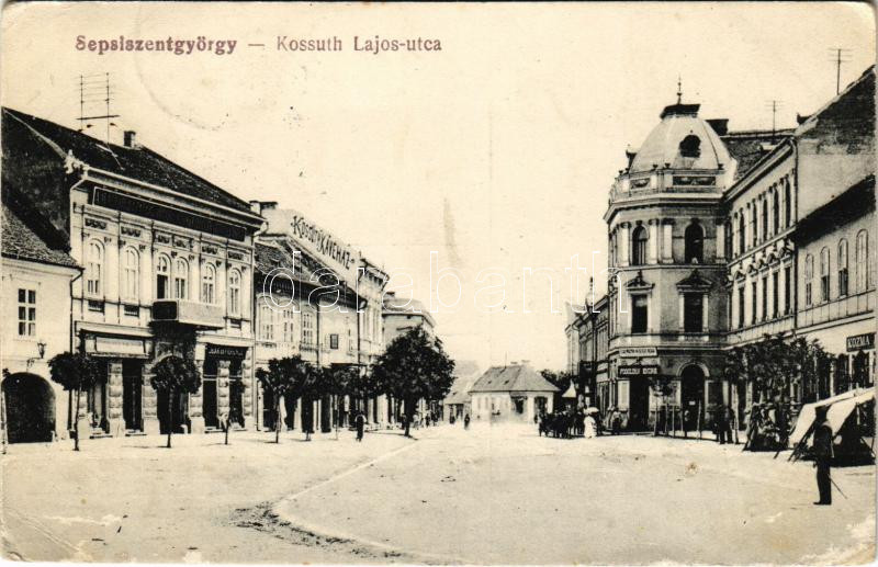 1918 Sepsiszentgyörgy, Sfantu Gheorghe; Kossuth Lajos utca, Kossuth kávéház, Deák és Ferencz, Kozma Lajos és Fogolyán Endre üzlete, piac. Benkő Mór kiadása / square, café, shops, market (EK)