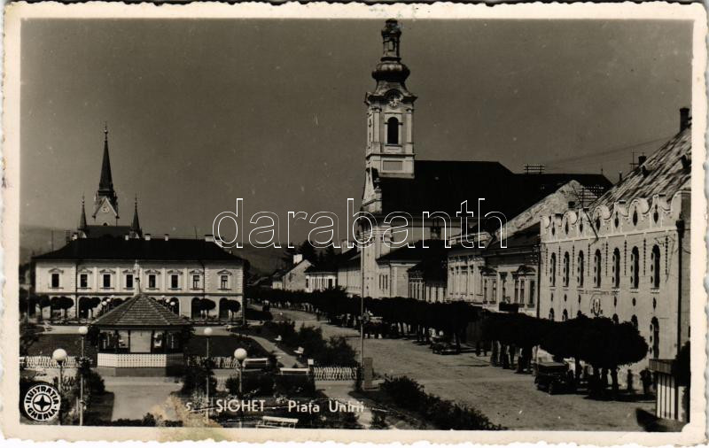 1938 Máramarossziget, Sighet, Sighetu Marmatiei; Fő tér, templom, leány iskola, autók / Liceul de fete, Piata Unirii / square, shops, church, girl school