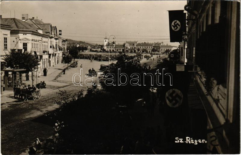 1940 Szászrégen, Reghin; bevonulás, horogkeresztes zászlók / entry of ... https://www.darabanth.com/de/435-Fernauktion/435.0/Ansichtskarten/Siebenburgen~2500008/1940-Szaszregen-Reghin-bevonulas-horogkeresztes-zaszlok-entry-of-the-Hungarian-troops-swa~II2813929
