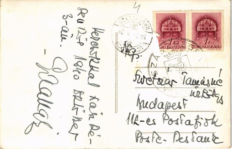 Beschreibung: 1940 Szászrégen, Reghin; bevonulás, horogkeresztes zászlók / entry of the Hungarian troops, swastika flags. photo + "1940 Szászrégen visszatért" So. Stpl.