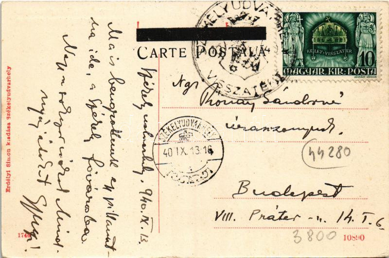 Beschreibung: 1940 Székelyudvarhely, Odorheiu Secuiesc; Római katolikus főgimnázium. Erdélyi Simon kiadása. 1746. (W.L. ?) / Internatul gimn. rom. cat. / Catholic grammar school + "1940 Székelyudvarhely visszatért" So. Stpl. (EK)