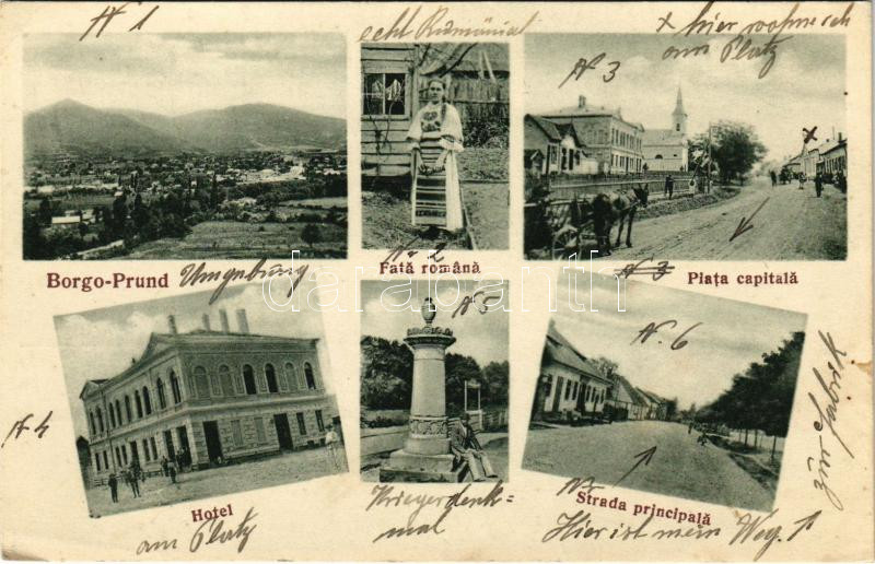 Borgóprund, Borgó-Prund, Prundu Bargaului; szálloda, román népviselet, Fő tér és utca, szobor / hotel, Romanian folklore, main square and street, monument (ázott / wet damage)