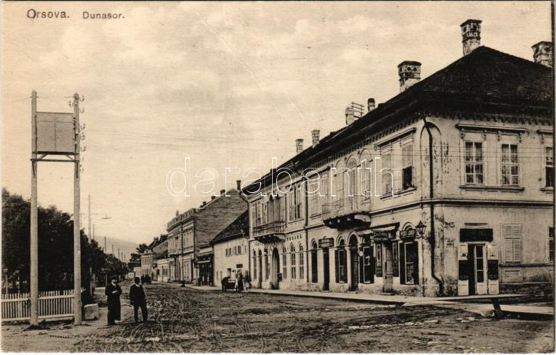 Beschreibung: Orsova, Dunasor, Weber János üzlete, zálogház, könyvnyomda. Hutterer G. / shops, street