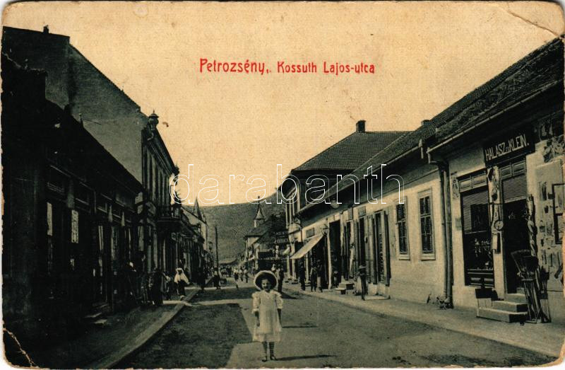 Petrozsény, Petrosani; Kossuth Lajos utca, Halász és Klein üzlete. W.L... https://www.darabanth.com/de/435-Fernauktion/435.0/Ansichtskarten/Siebenburgen~2500008/Petrozseny-Petrosani-Kossuth-Lajos-utca-Halasz-es-Klein-uzlete-WL-1682-street-view-with~II2818602