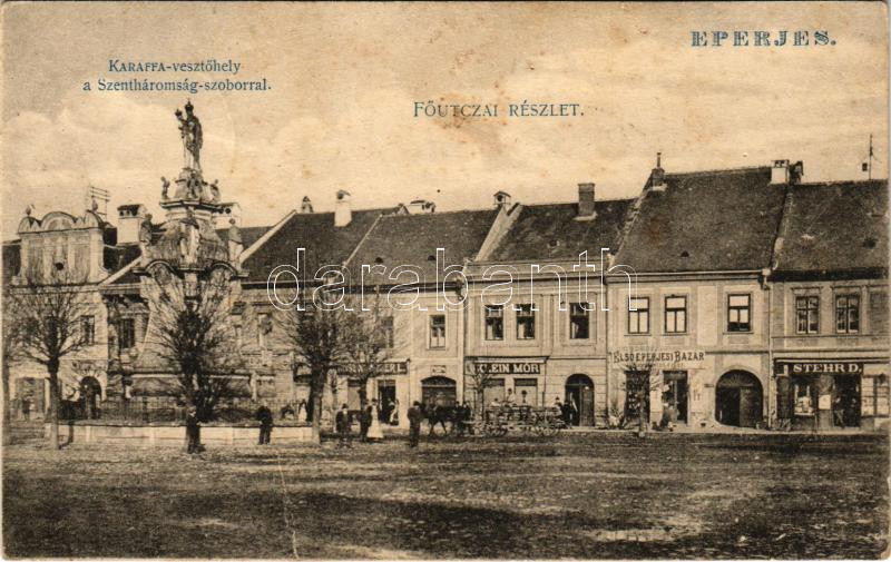 1907 Eperjes, Presov; Fő utca, Karaffa vesztőhely, Szentháromság szobor, Klein Mór, L. Rosenwasser, Stehr D. és Első Eperjesi Bazár üzlete. Divald / main street, statue, shops (fa)
